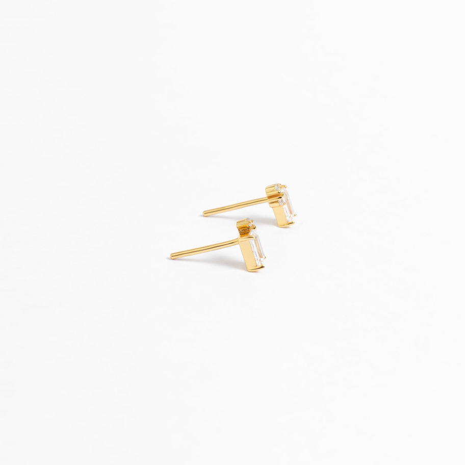 Un hermoso y delicado par de aretes en Oro Vermeil de 18k y simulación de diamantes corte esmeralda.